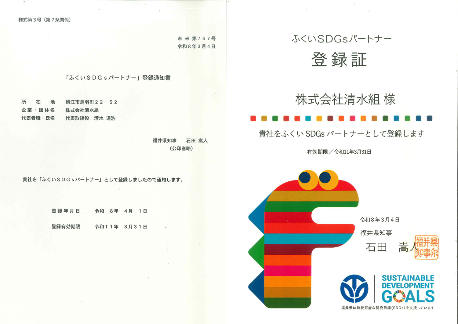 2026年03月04日 ふくいSDGsパートナー 福井県がSDGsの理念に沿いながら、持続可能な 地域・社会づくりを全県一体となって進める「ふくいSDGsパートナー」に 清水組が登録されました。 一覧へ戻る